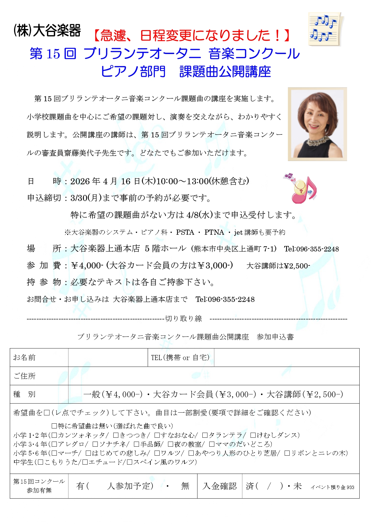 日時:2026年4月23日(木)10:00~開催決定 場所:大谷楽器 上通本店 5階ホール
