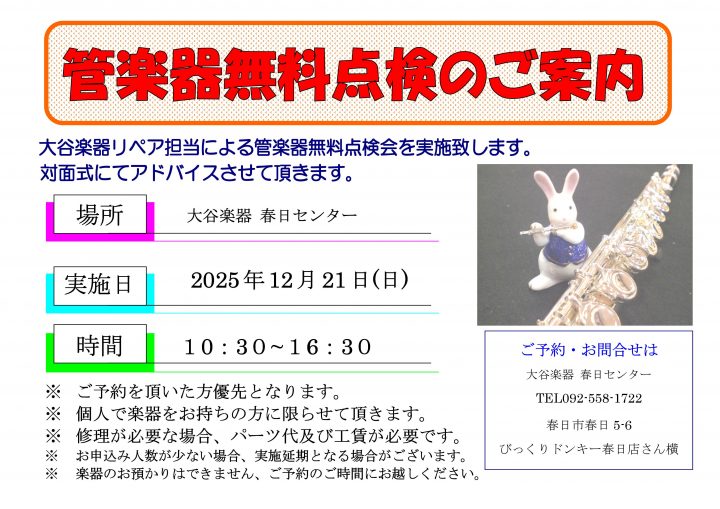 「管楽器無料点検会」を12月21日(日)に実施いたします。