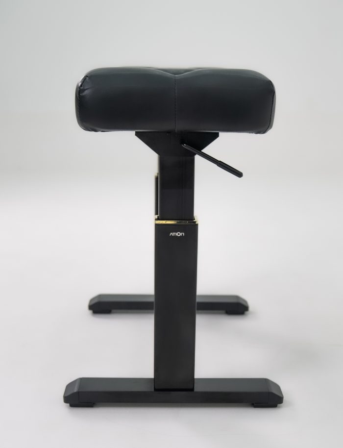 従来のピアノ椅子はサイドのハンドルを何回もクルクル回して調節していましたが、こちらのピアノ椅子はレバーを下げる(緩める)と座面がスイーっと勝手に上がってくるんです!