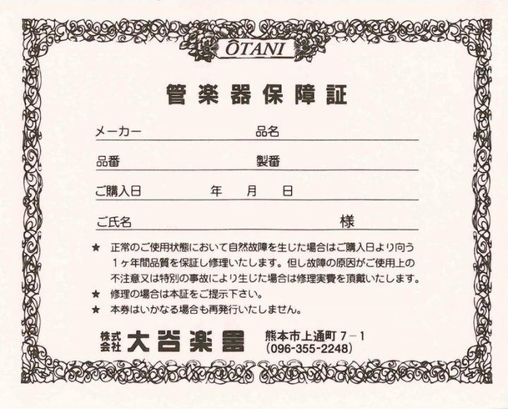 - 大谷楽器の管楽器保障証をご提示いただいた場合、料金は 1,100円(税込) となります。ご提示がない場合は対象外となりますのでご了承ください。