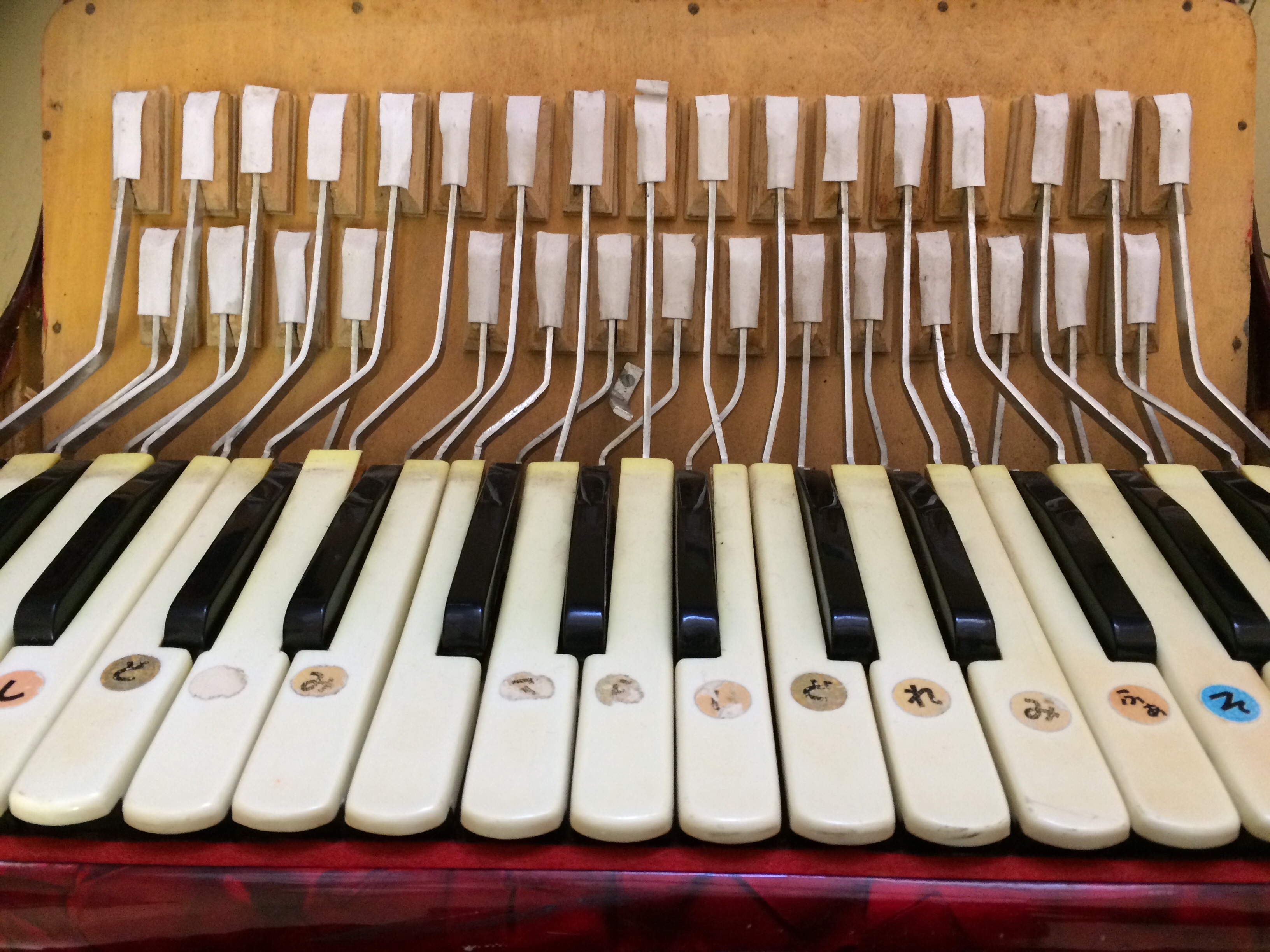 なかにはこんなアコーディオンも。鍵盤がひとつだけ上がってしまっています。