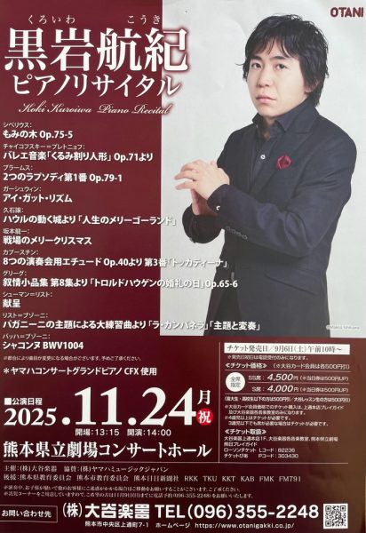 いよいよ来週24日(祝月)は黒岩航紀さんピアノリサイタルが開催されます。