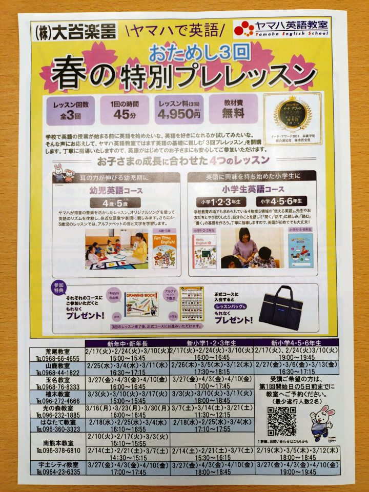 ヤマハの英語では、プレレッスンの生徒さんを募集しています。