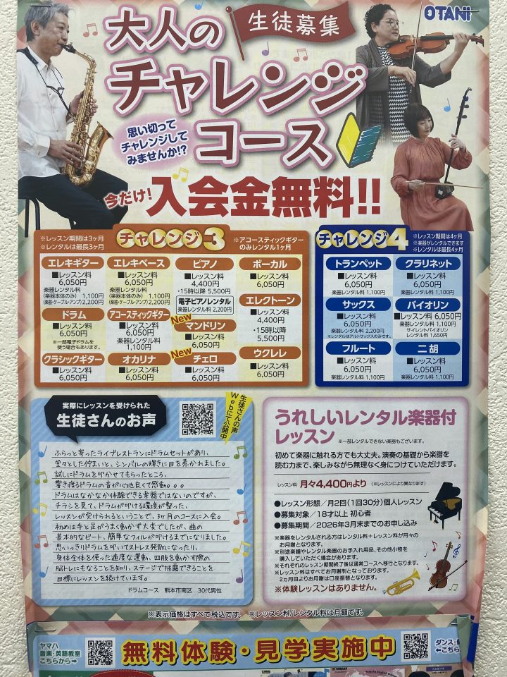 大人の方のチャレンジコースとしまして、入会金無料で、3~4ヶ月間(習うコースによって変わります)お月謝もリーズナブルに、お気楽にはじめることができます😀