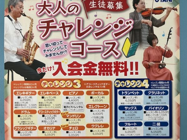 さて、大人の楽器初心者向けのチャレンジコースの募集は、3月末までとなっていますよ❗