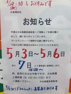 (5/5のドラムのレッスンのみ通常通りあります。)